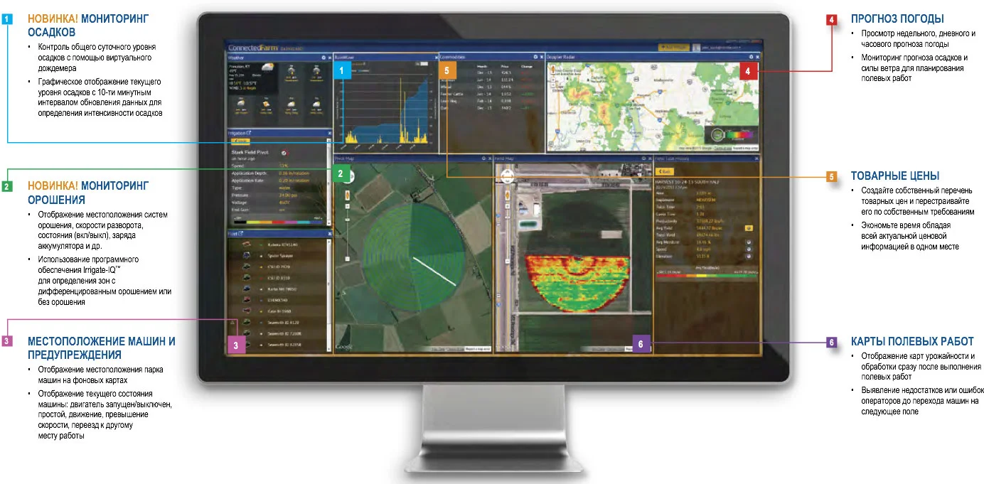 - Просмотр в реальном времени цен на продукцию, информации об уровне осадков, карт обработки, местоположения и загрузки техники, состояния оросительной системы и многого другого